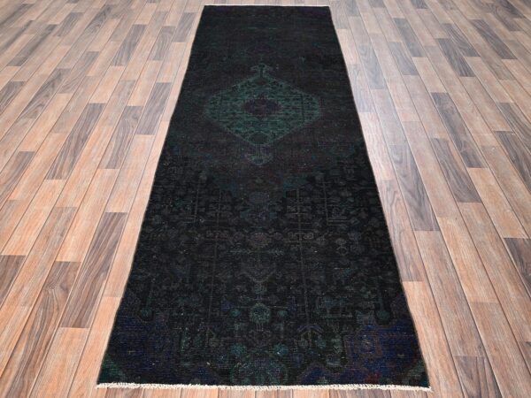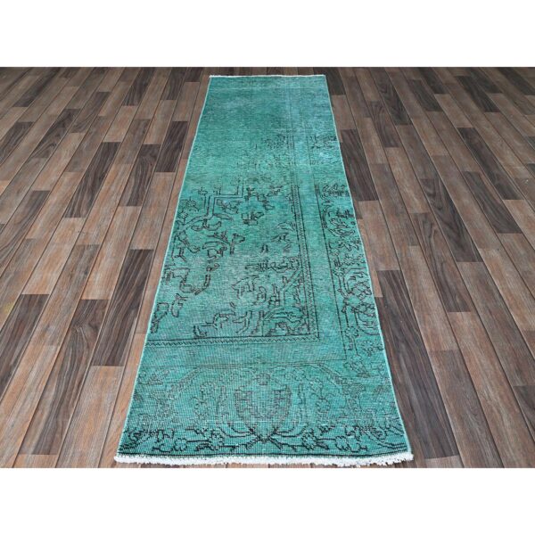 2’4″x10’2″ Bottle Green, Overdyed Vintage Persian Tabriz, Worn and Distressed, Hand Knotted, 100% Wool, Sides and Ends Professionally Secured, Sheared Low, Fragment, Narrow Runner, Oriental Rug HR942