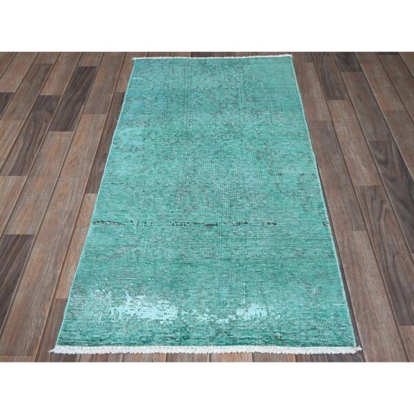 2’3″x7’5″ Wasabi Green, Overdyed Vintage Persian Tabriz with Distinct Abrash, Worn and Distressed, Sides and Ends Professionally Secured, Shaved Low, Hand Knotted, 100% Wool, Fragment, Narrow Runner, Oriental Rug HR946
