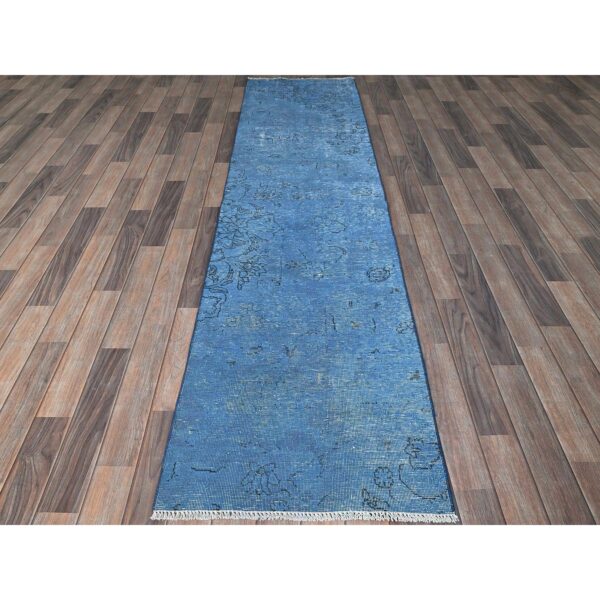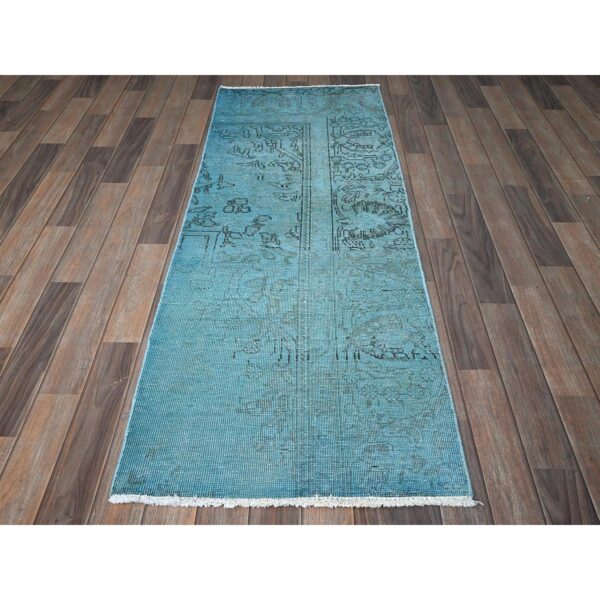 2’5″x11’1″ Tile Blue, Overdyed Vintage Persian Tabriz, Shaved Down, Worn and Distressed, Sides and Ends Professionally Secured, Hand Knotted, 100% Wool, Fragment, Narrow Runner, Oriental Rug HR935