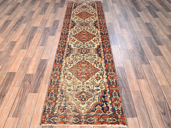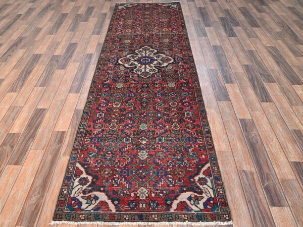 2’10″x9’3″ Brick Red, Vintage Persian Hussainabad with Flower Medallion Design, 100% Wool, Hand Knotted, Worn Down and Distressed, Zero Pile, Sides and Ends Professionally Secured, Runner, Oriental Rug HR1682