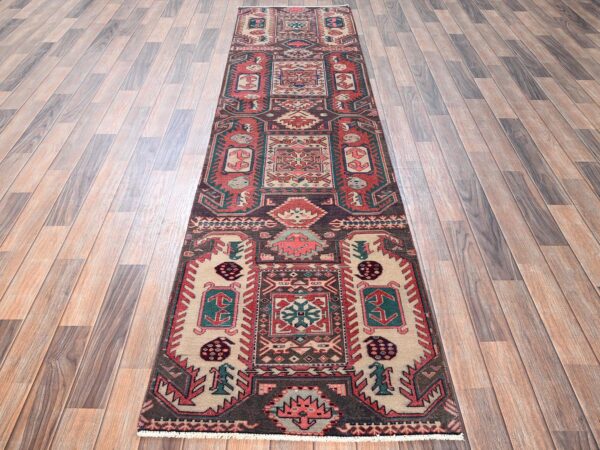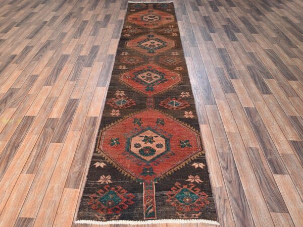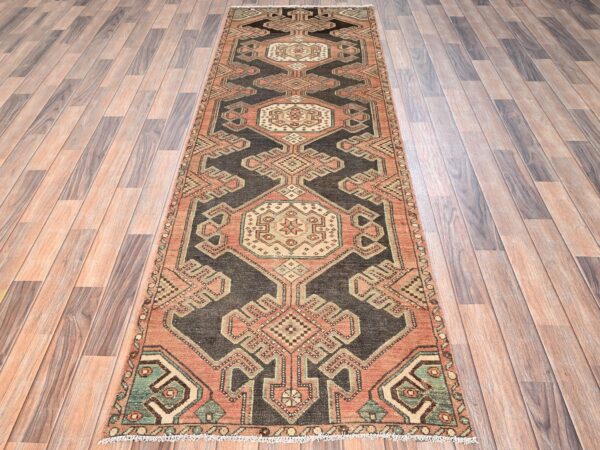2’10″x9′ Chocolate Brown, Vintage Northwest Persian with Geometric Medallions Design, 100% Wool, Hand Knotted, Cropped Thin, Even Wear, Sides and Ends Professionally Secured, Good Condition, Runner, Oriental Rug HR1716