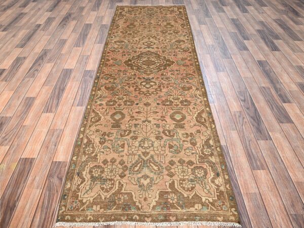 2’3″x8’3″ Almond Brown, Vintage Persian Tabriz with Fish Mahi All Over Geometric Herat Design, Worn and Distressed, Sheared Low, Zero Pile, Hand Knotted, 100% Wool, Narrow Runner, Oriental Rug HR1674