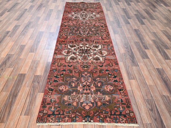 2’10″x9’9″ Blush Red, Vintage Persian Karajeh with Medallions Design, Worn Down and Distressed, Cropped Thin, 100% Wool, Hand Knotted, Zero Pile, Sides and Ends Professionally Secured, Runner, Oriental Rug HR1800