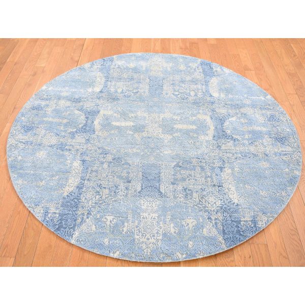 6’x6′ Denim Blue, Rajasthan with All Over Leaf Design, Wool and Silk Hand Knotted Thick and Plush, Round Oriental Rug HR80143