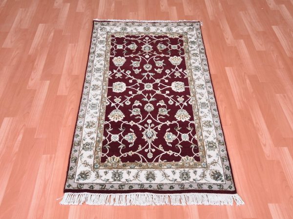 3’x5′ Burgundy Red, Thick and Plush, Wool and Silk, Hand Knotted, Rajasthan, All Over Leaf Design, Oriental Rug HR75049