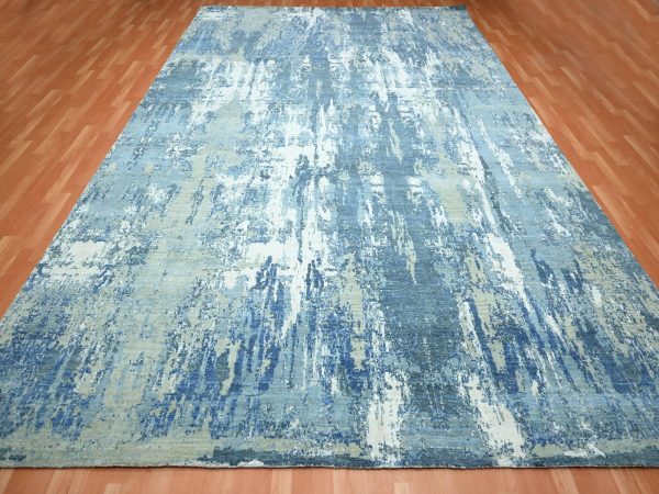 10’1″x14’2″ Imperial Blue, Abstract Design, Hand Knotted, Hi-Low Pile, Wool and Real Silk, Oriental Rug HR75530
