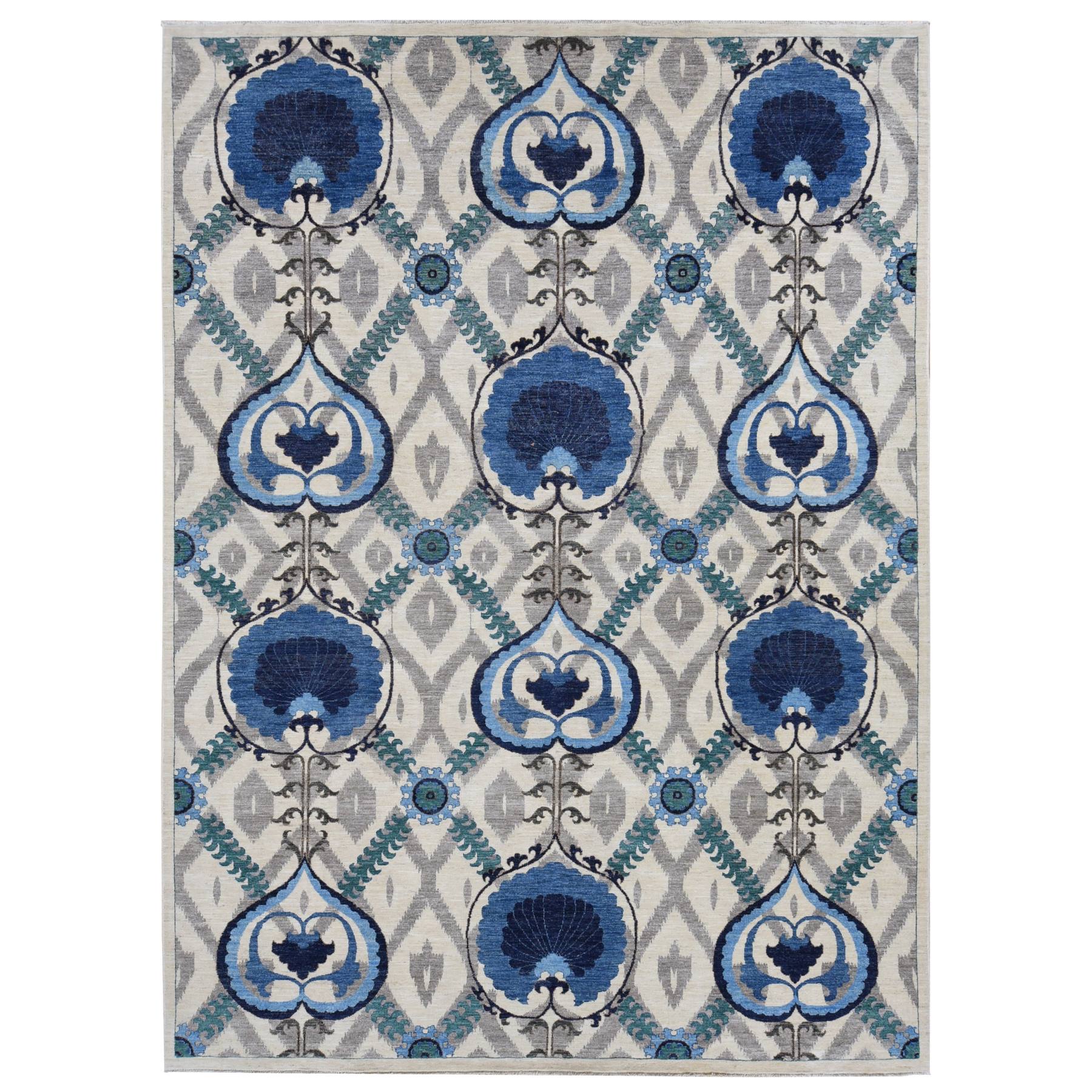 10’x13’9″ Ivory, On Clearance, Hand Knotted, Arts and Crafts Design, Repetitive Heart Shape and Large Leaves, Pure Wool, Oriental Rug HR87511
