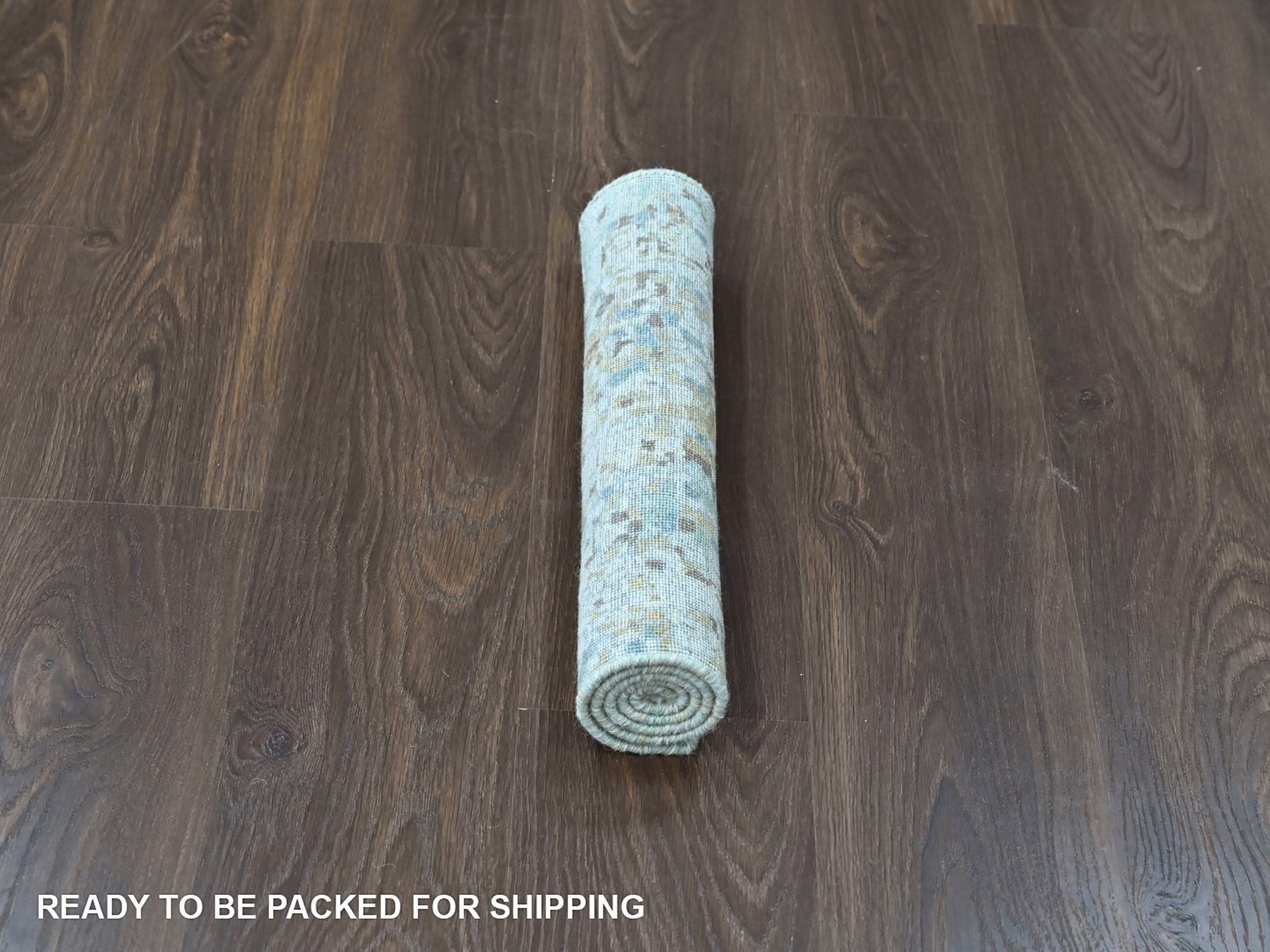 1’10″x3′ Bay Green with Gold, Abstract Design, Wool and Silk, Thick and Plush, Hand Knotted, Mat, Sample, Oriental Rug HR10430