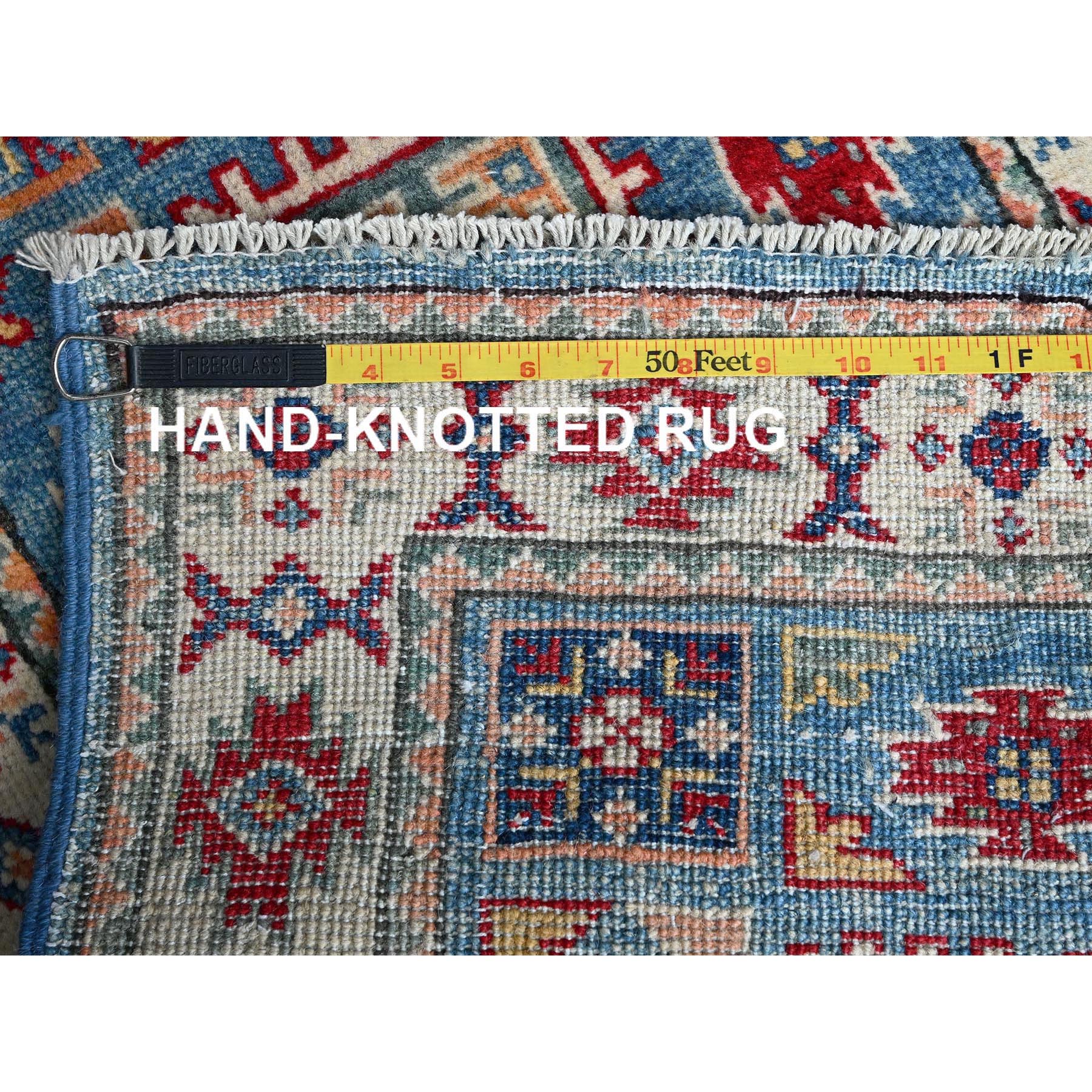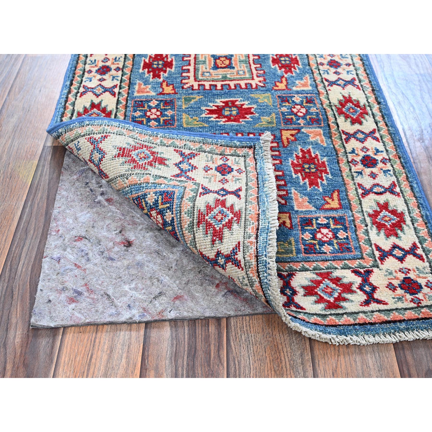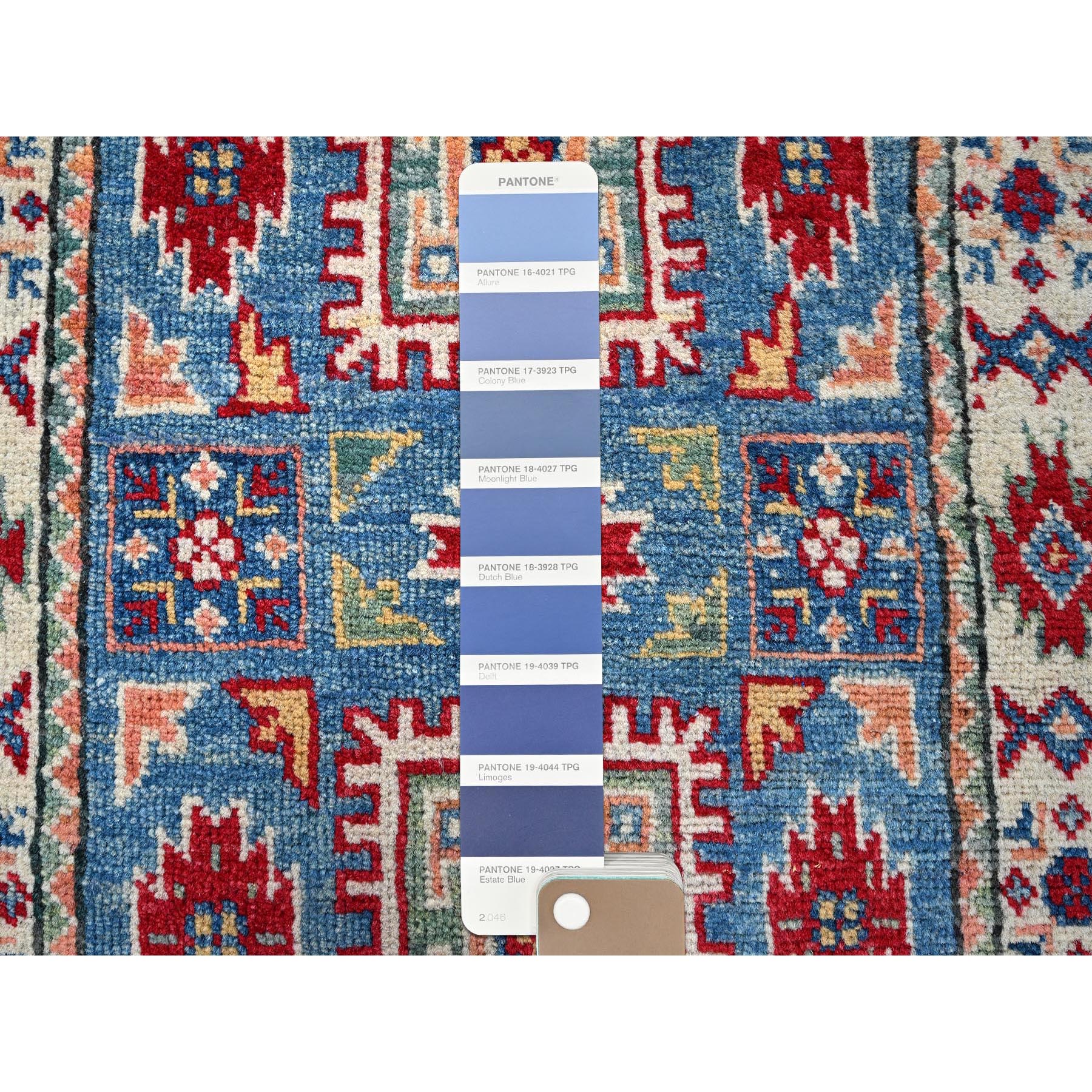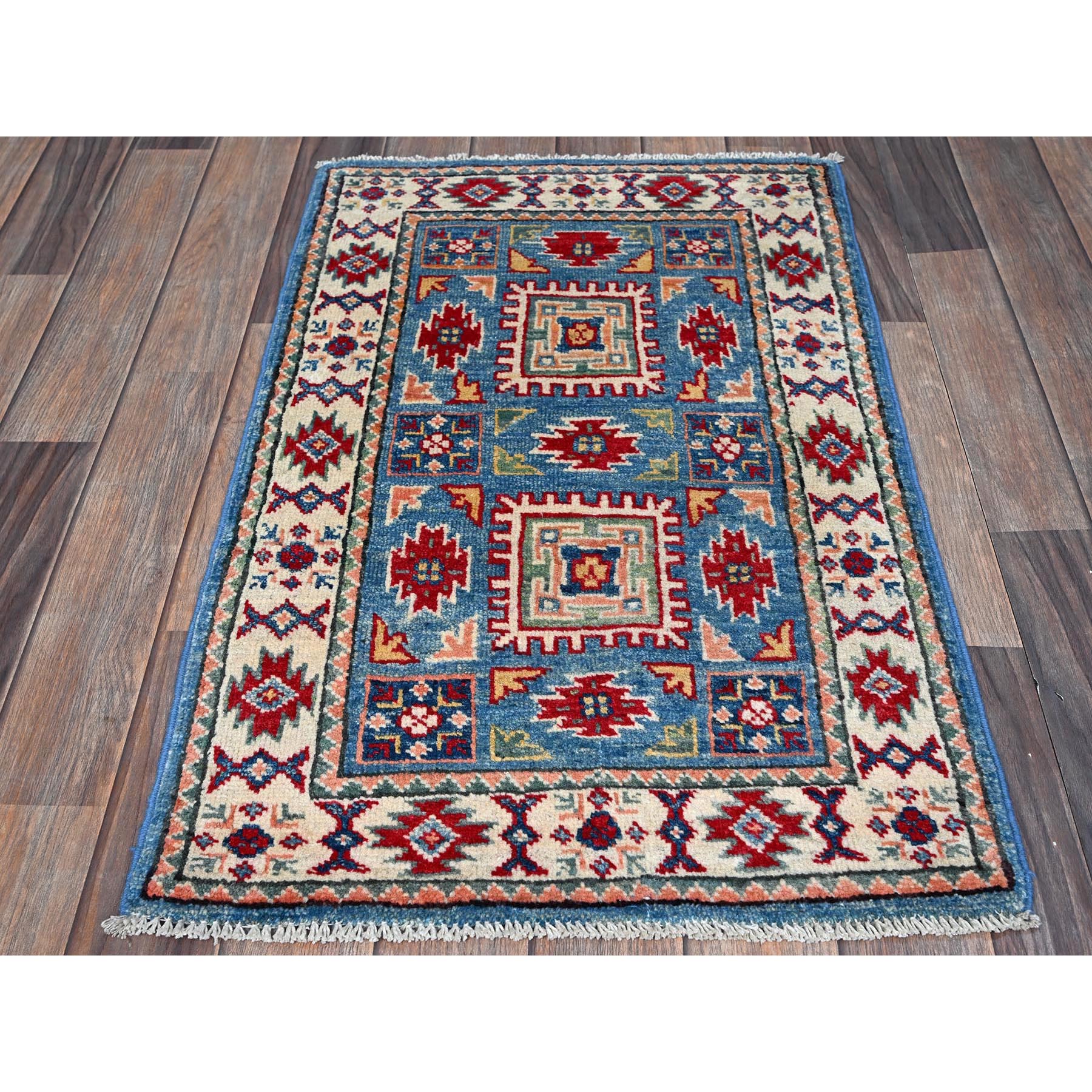 1’10″x3′ Dutch Blue, Kazak with Geometric Medallions Design, Vegetable Dyes, Hand Knotted, Soft Wool, Denser Weave, Sample, Mat, Oriental Rug HR378