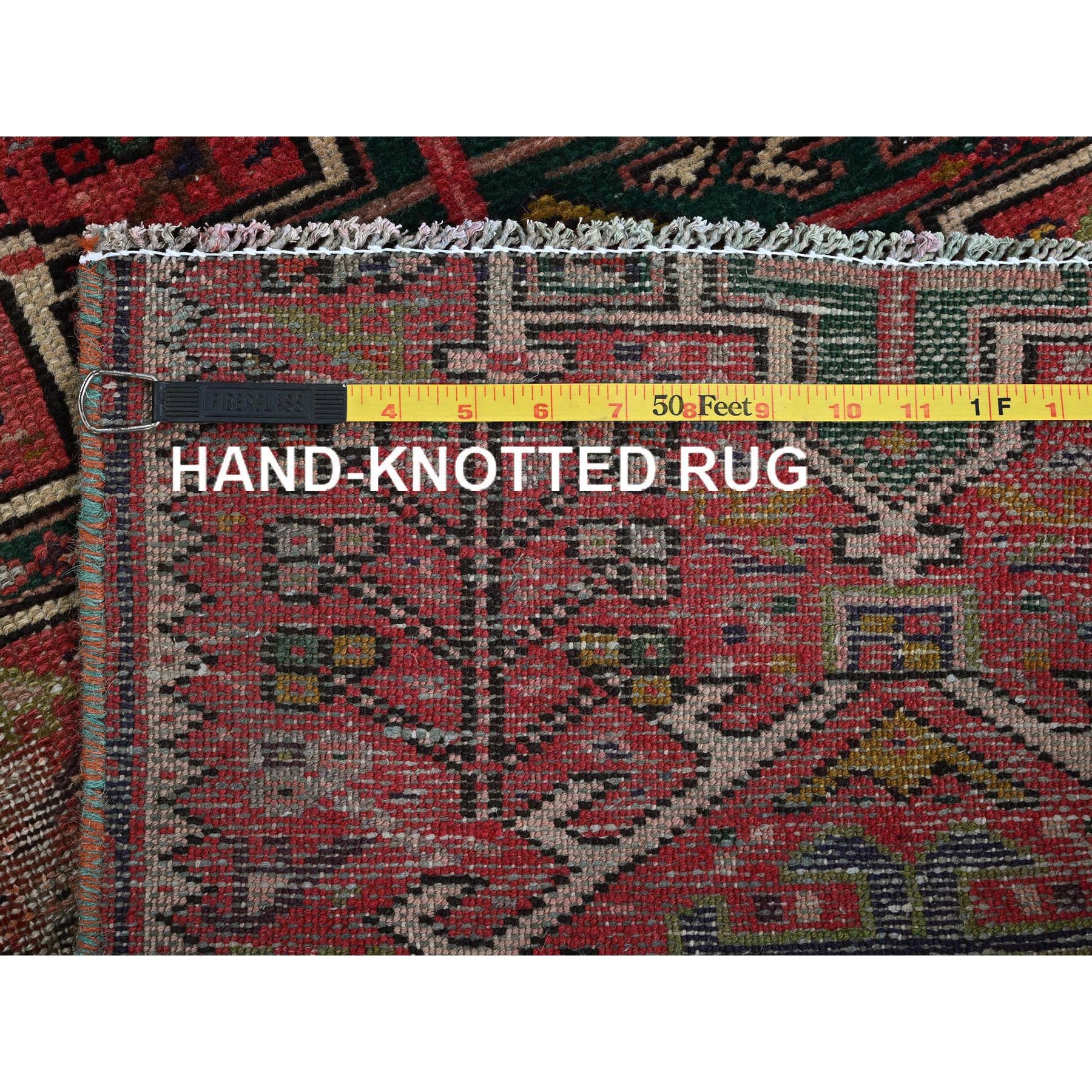 1’10″x4’2″ Blush Red, Vintage Persian Karajeh Heriz with Geometric Medallions, Abrash, Sheared Low, Zero Pile, Evenly Worn, Sides and Ends Professionally Secured, Clean, Hand Knotted, Pure Wool, Fragment, Short & Narrow Runner, Oriental Rug HR974