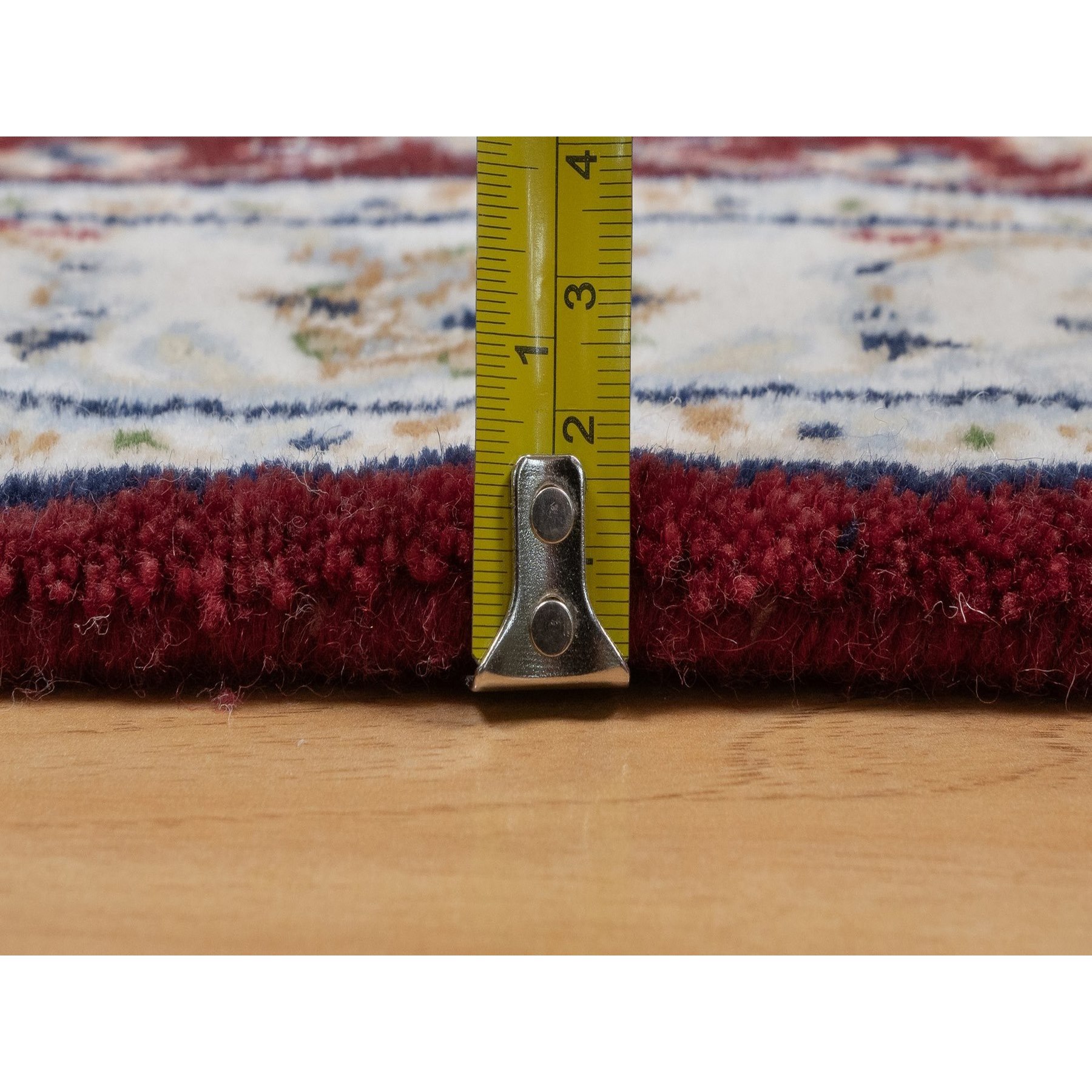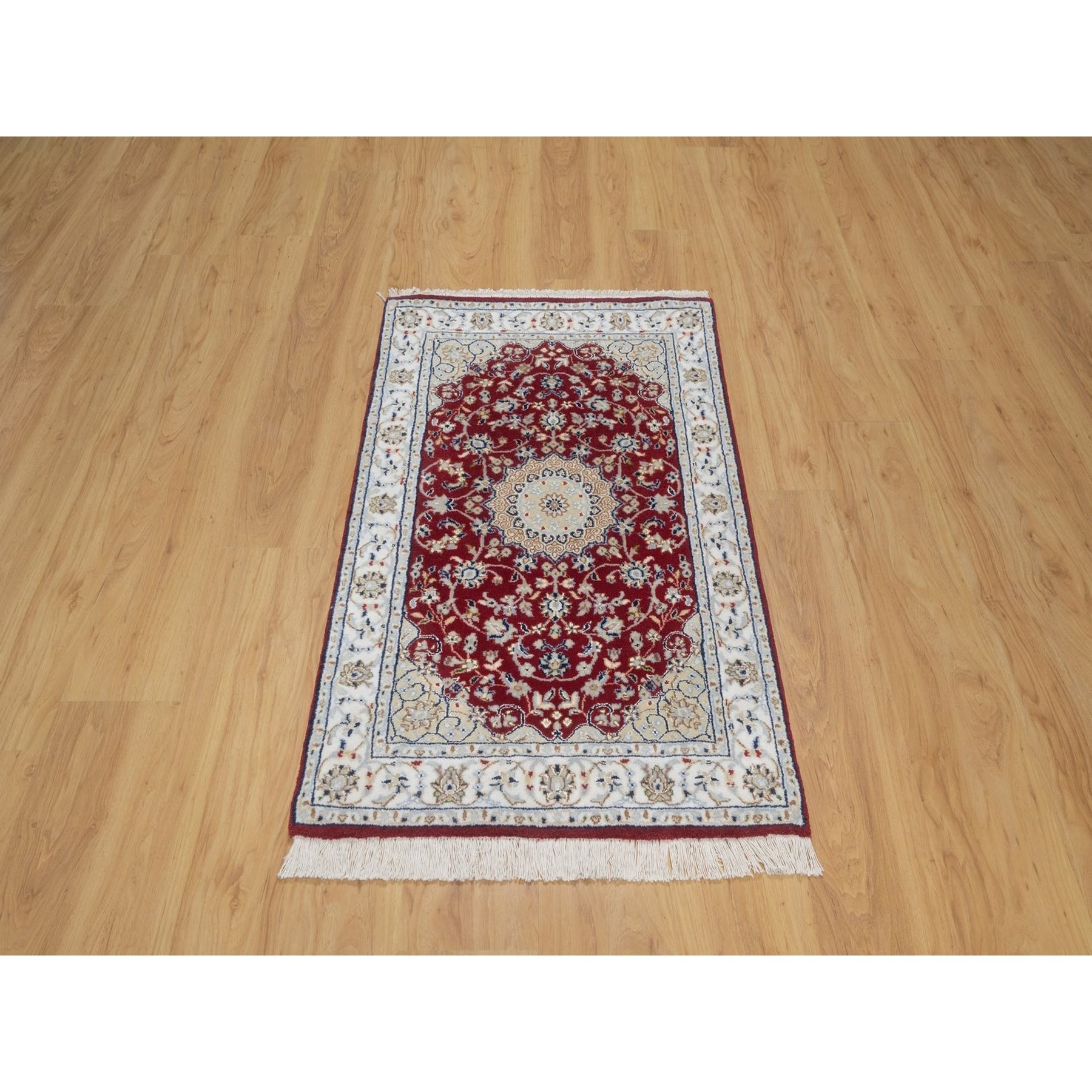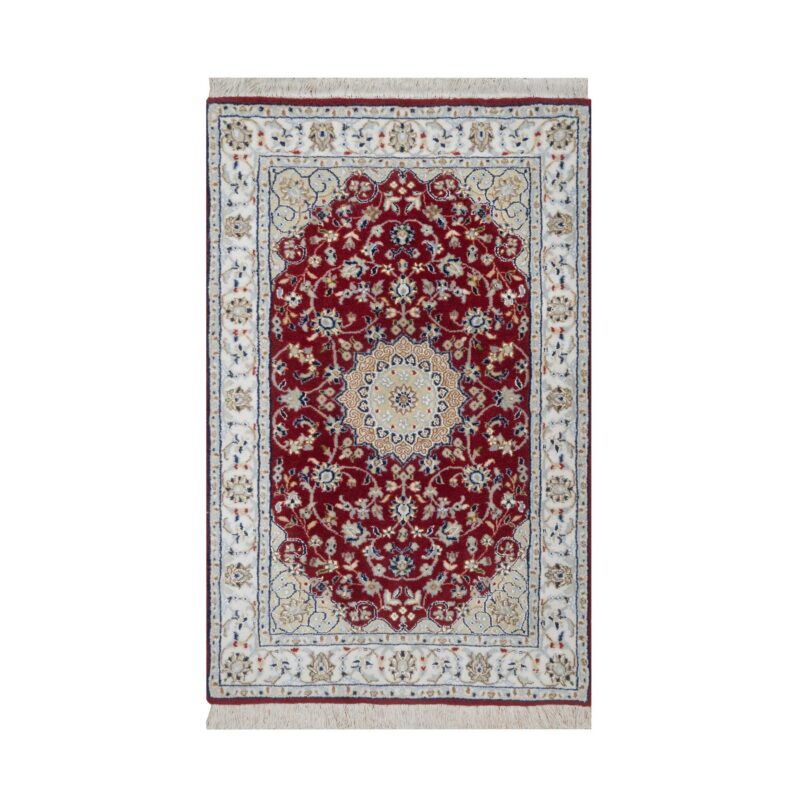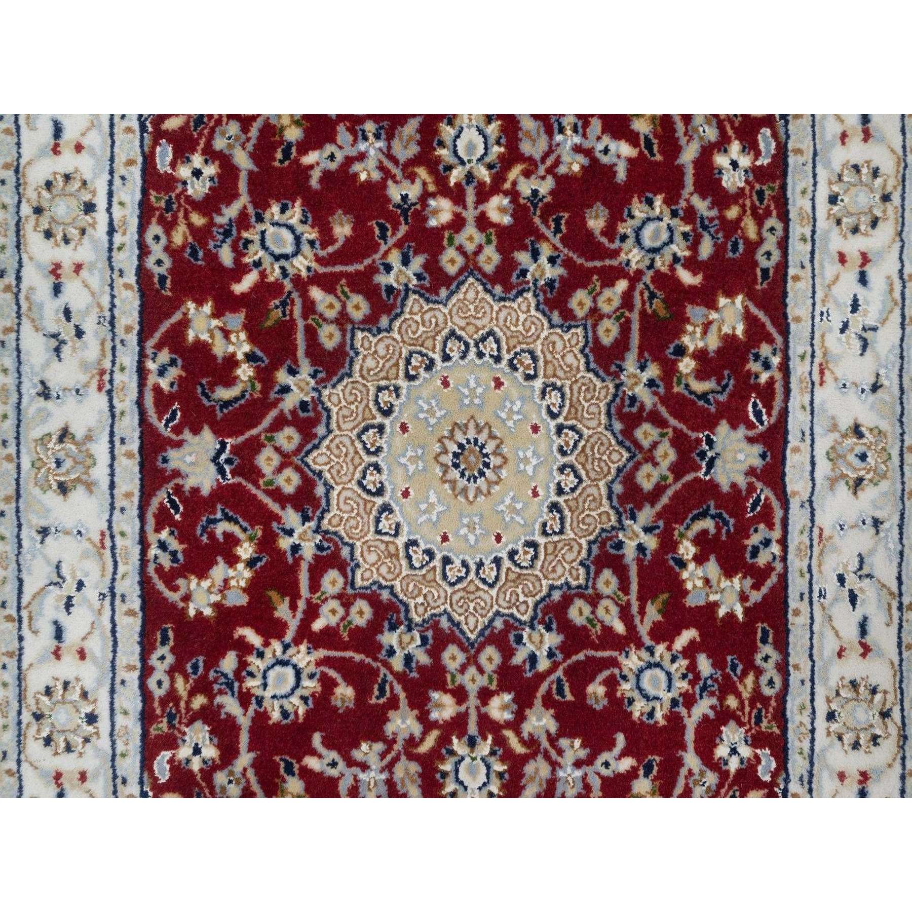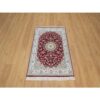 2’6″x4’1″ Rhubarb Red, Nain with Flower Medallion Design, Hand Knotted, Wool and Silk, Soft Pile, 250 KPSI, Mat, Sample, Oriental Rug HR91572
