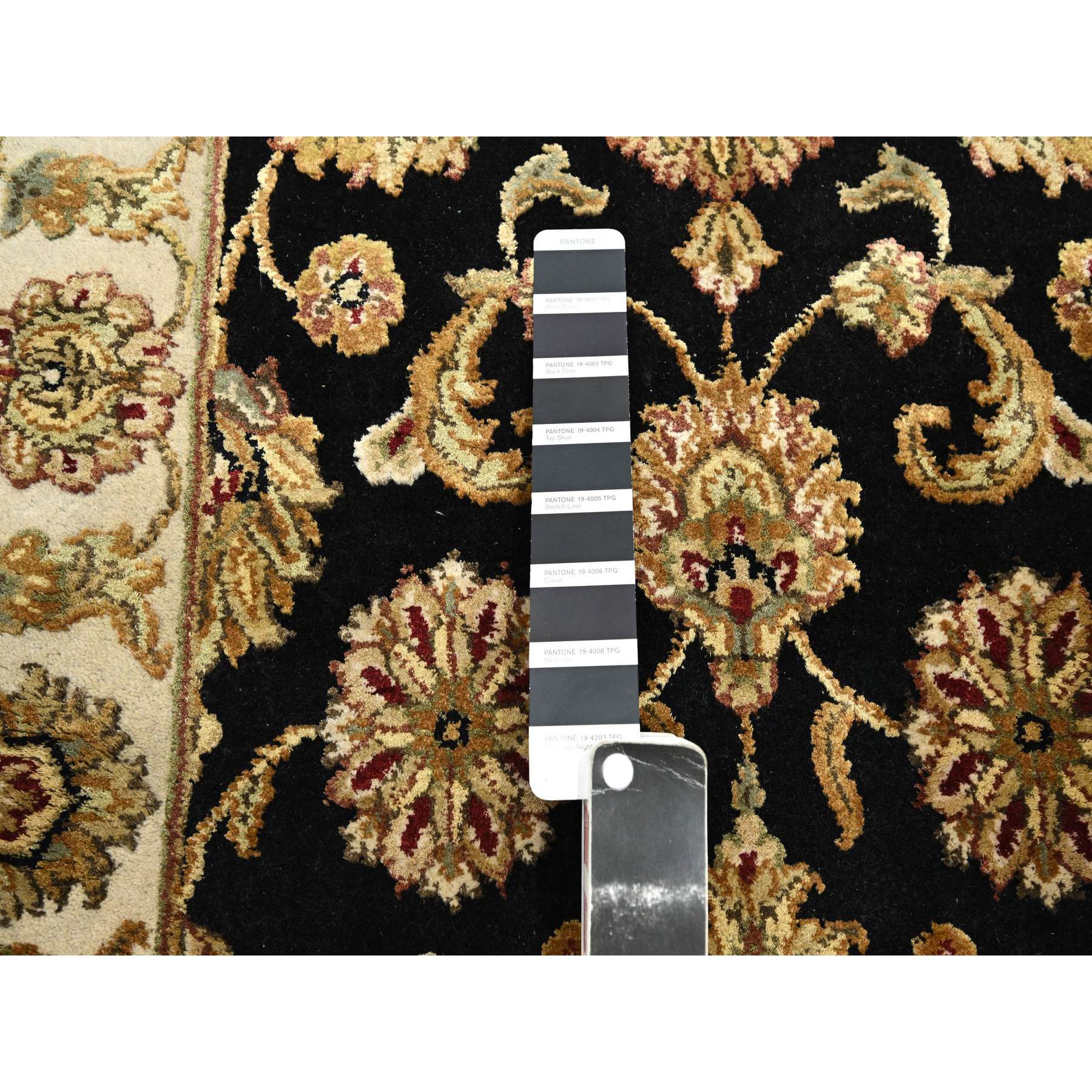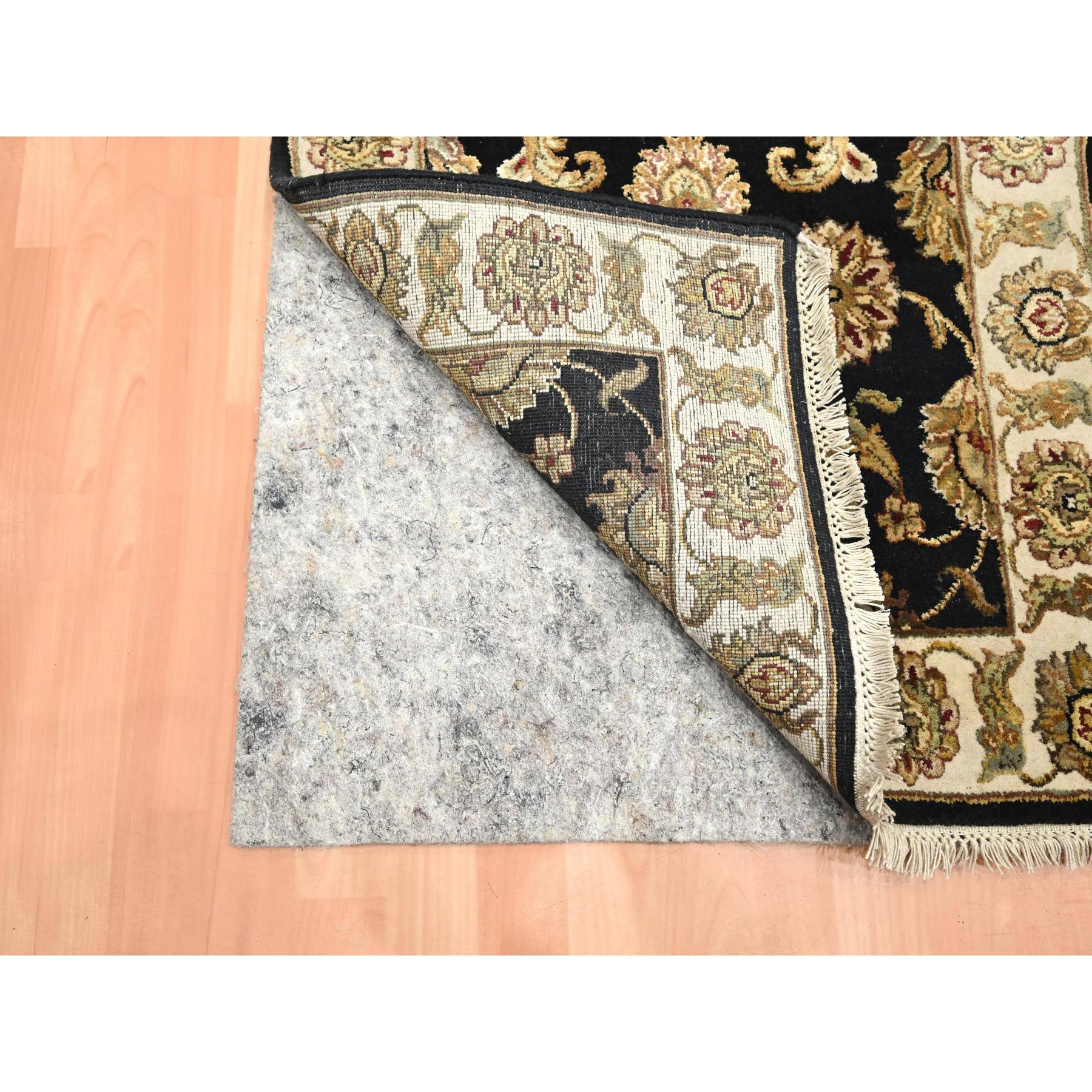 2’6″x8′ Ink Black, Hand Knotted, Rajasthan with All Over Leaf Design, Wool and Silk, Densely Woven, Thick and Plush, Runner, Oriental Rug HR75624