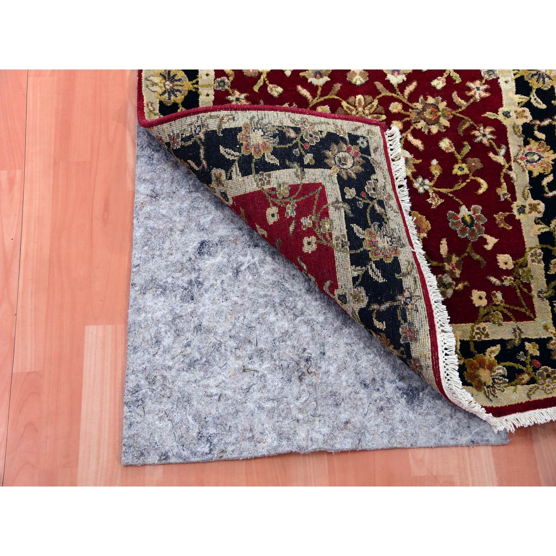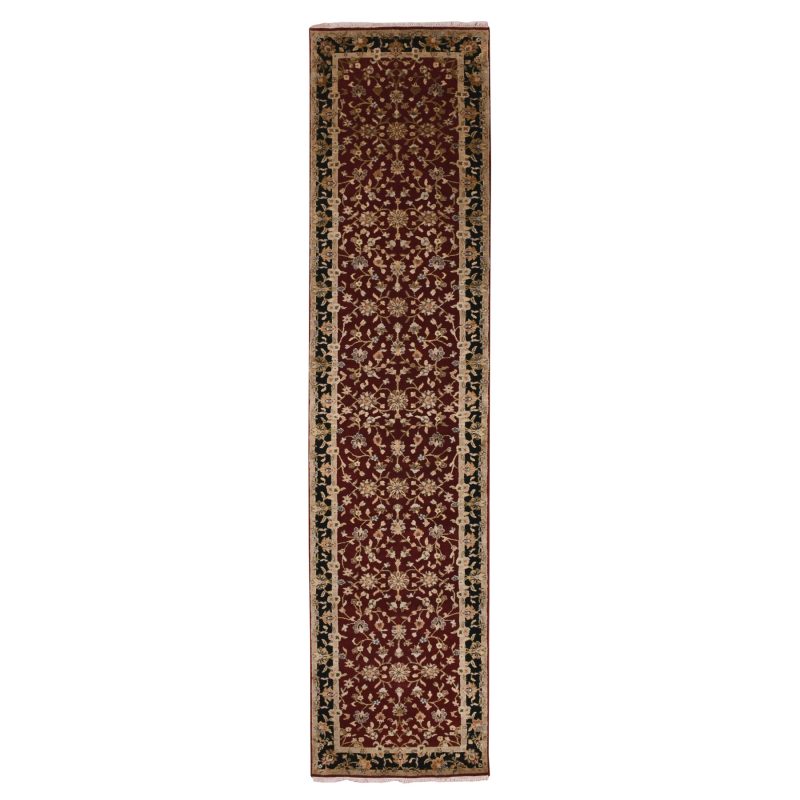 2’9″x12’3″ Barn Red With Black Border, Wool and Silk Hand Knotted, Rajasthan All Over Leaf Design Thick and Plush, Runner Oriental Rug HR75378
