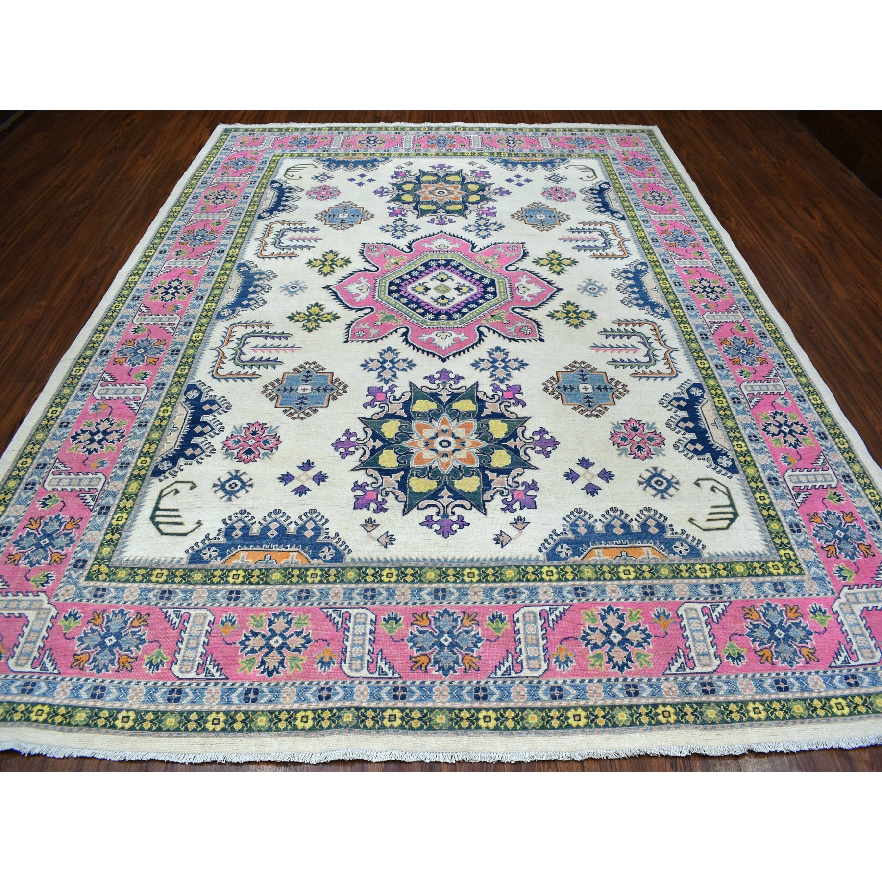 8’10″x11’6″ Ivory with Pink Fusion Kazak Natural Wool Hand Knotted Oriental Rug HR55538