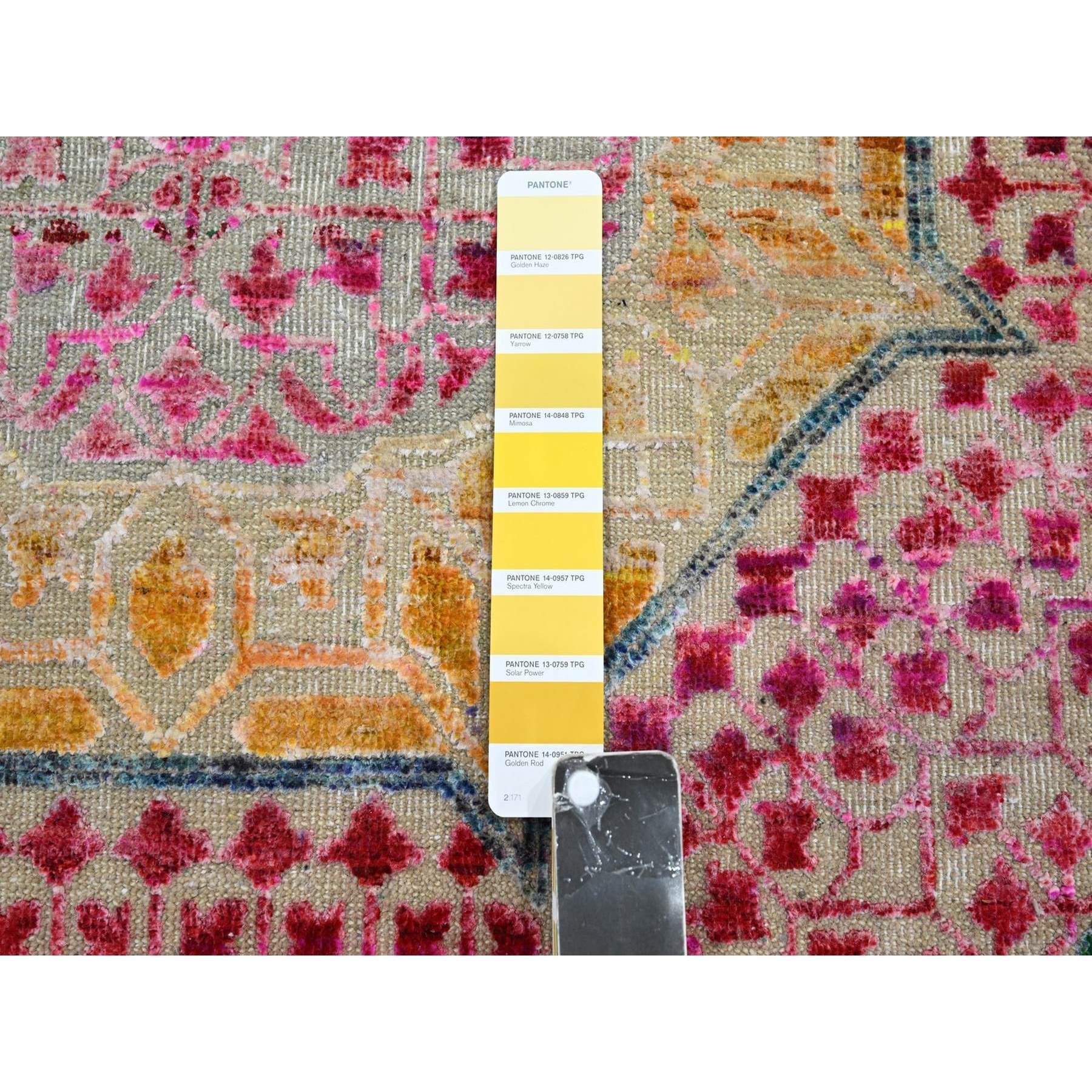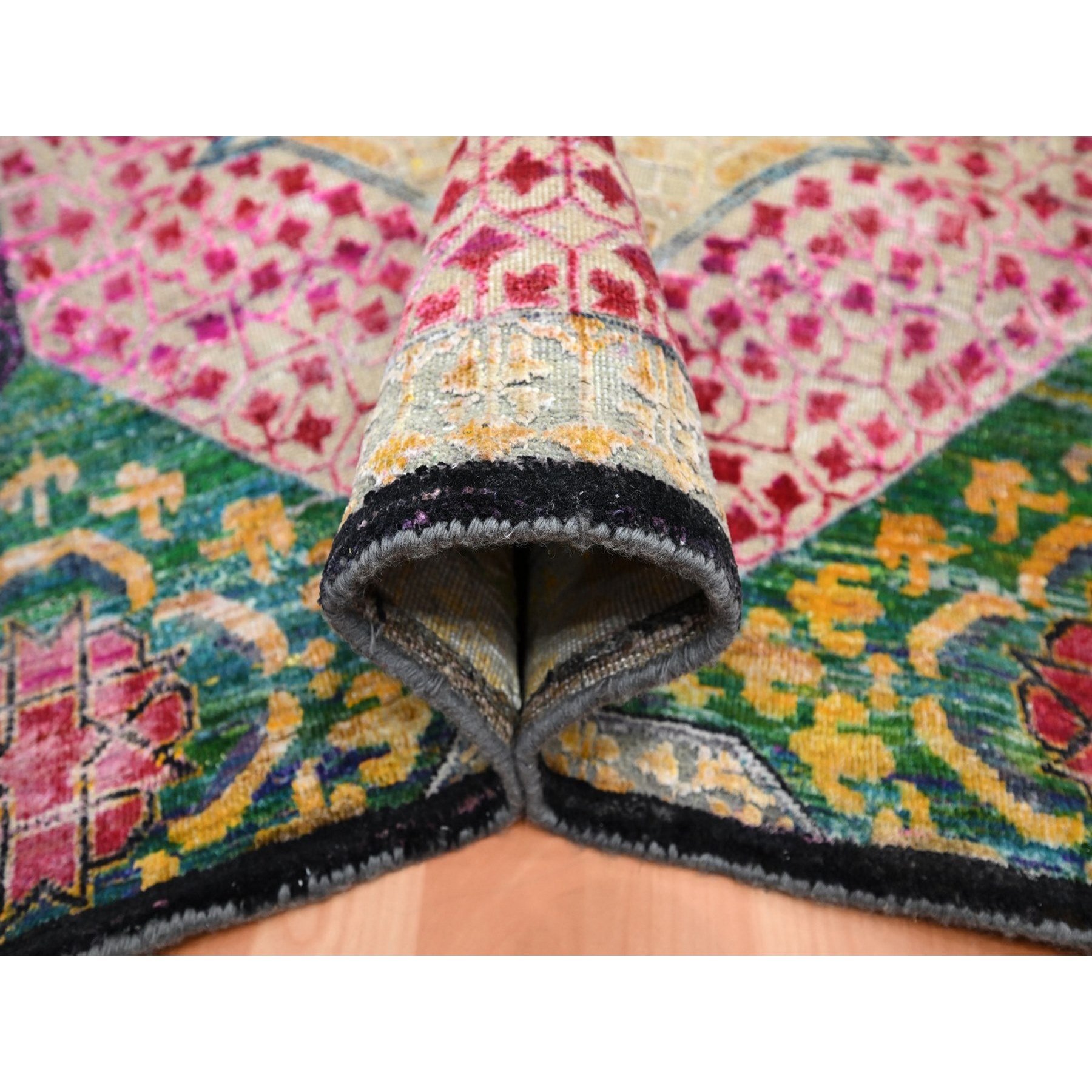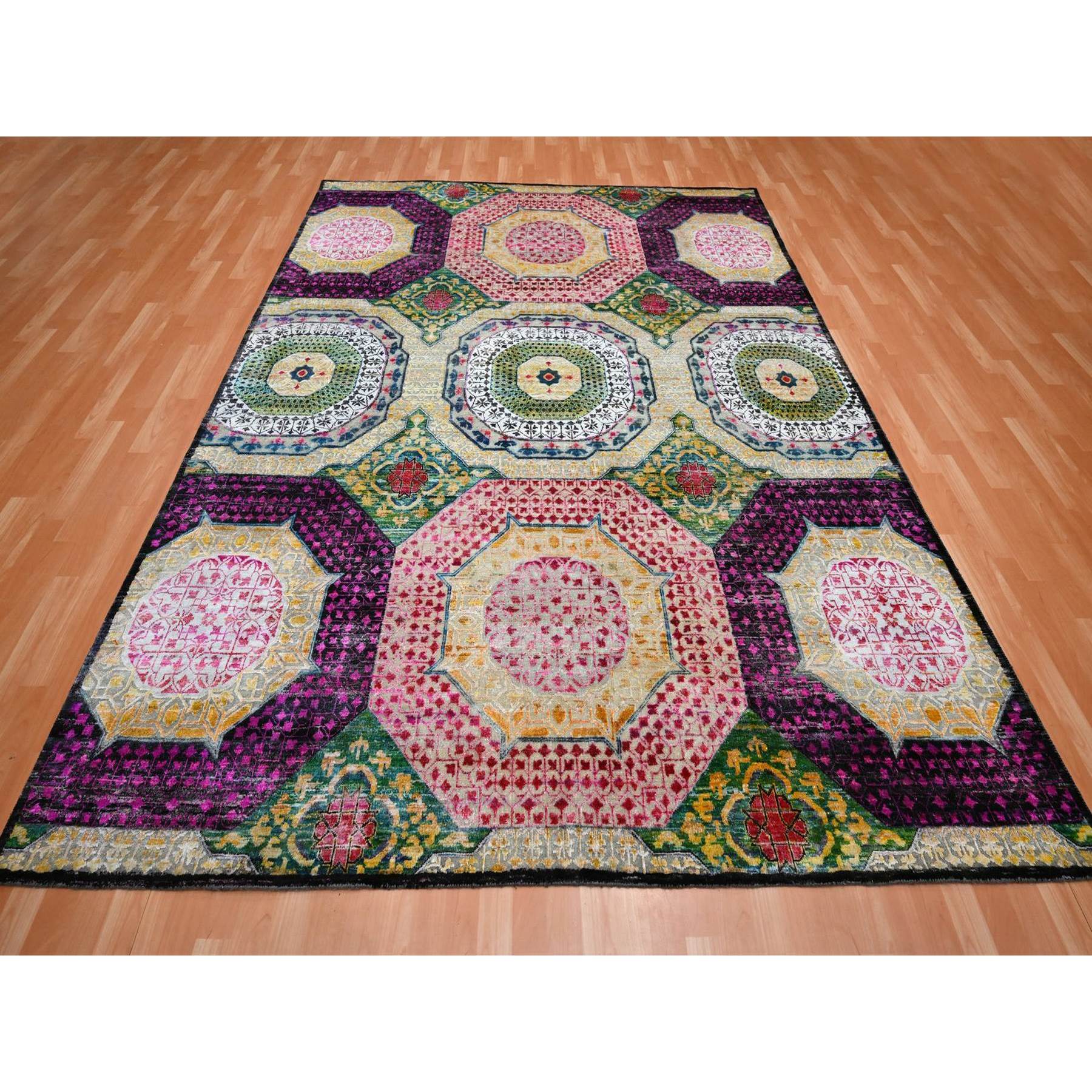 8’x10’2″ Lemon Yellow, Colorful Mamluk Design, Hand Knotted, Sari Silk with Textured Wool, Oriental Rug HR75729