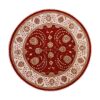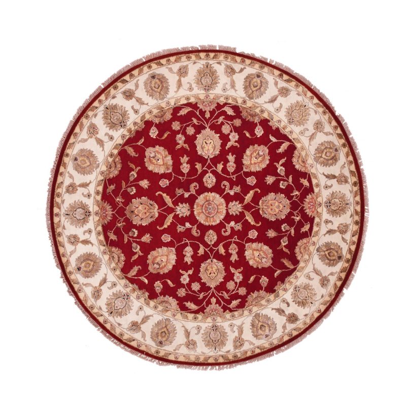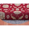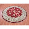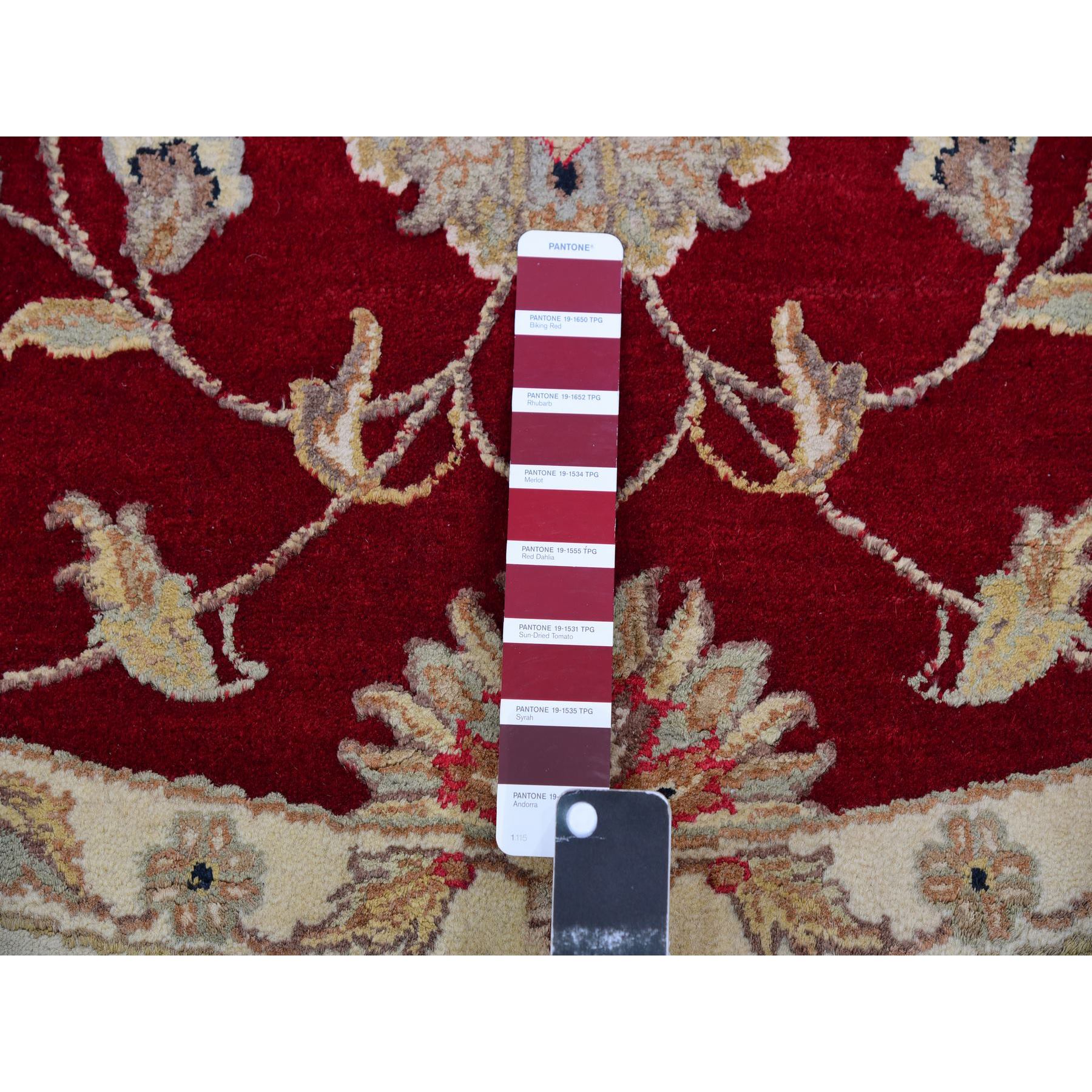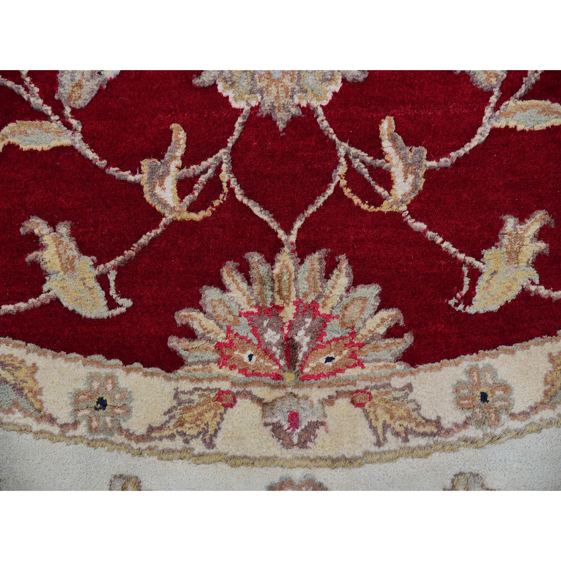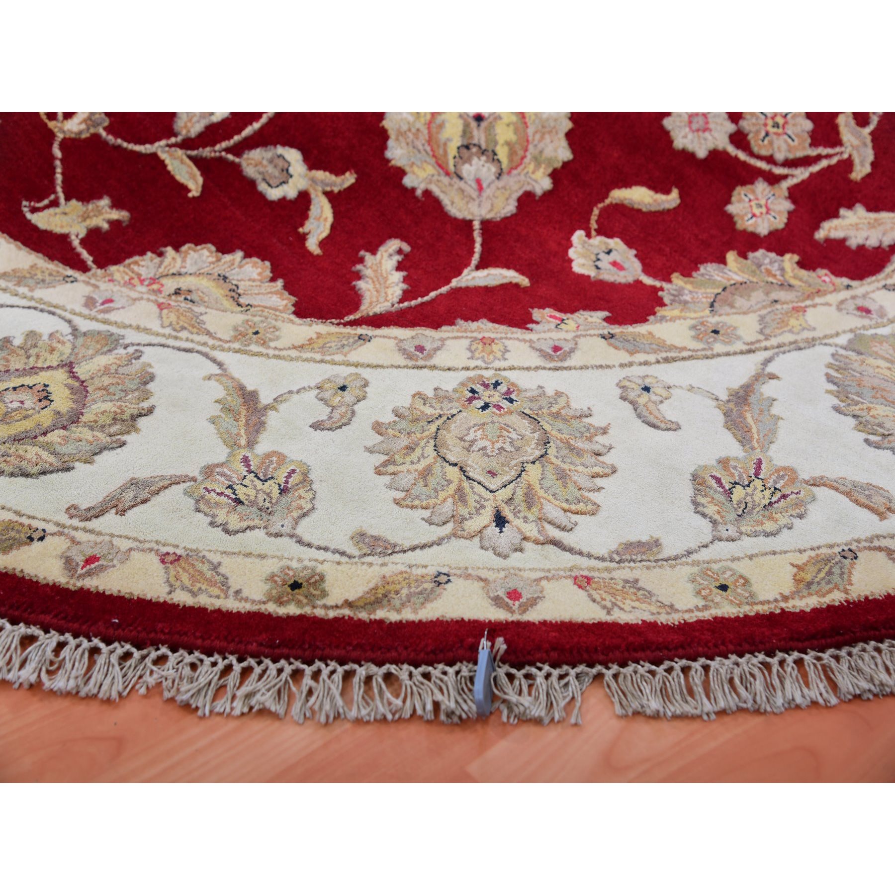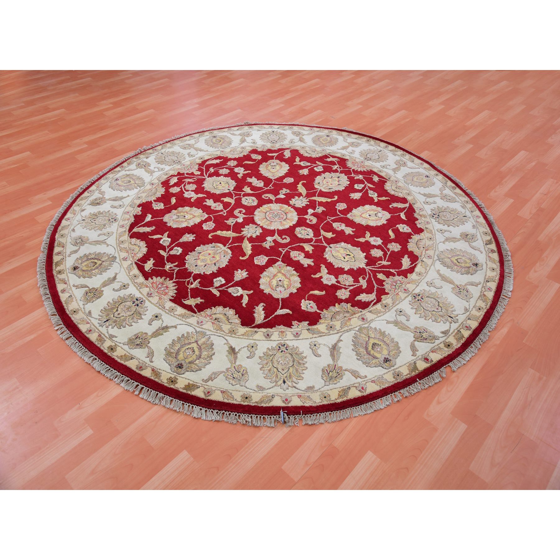 8’x8′ Rhubarb Red With Linen White, Wool and Silk Hand Knotted Thick and Plush, Soft Pile, Rajasthan Design and All Over Leaf Pattern, Round Oriental Rug HR75356