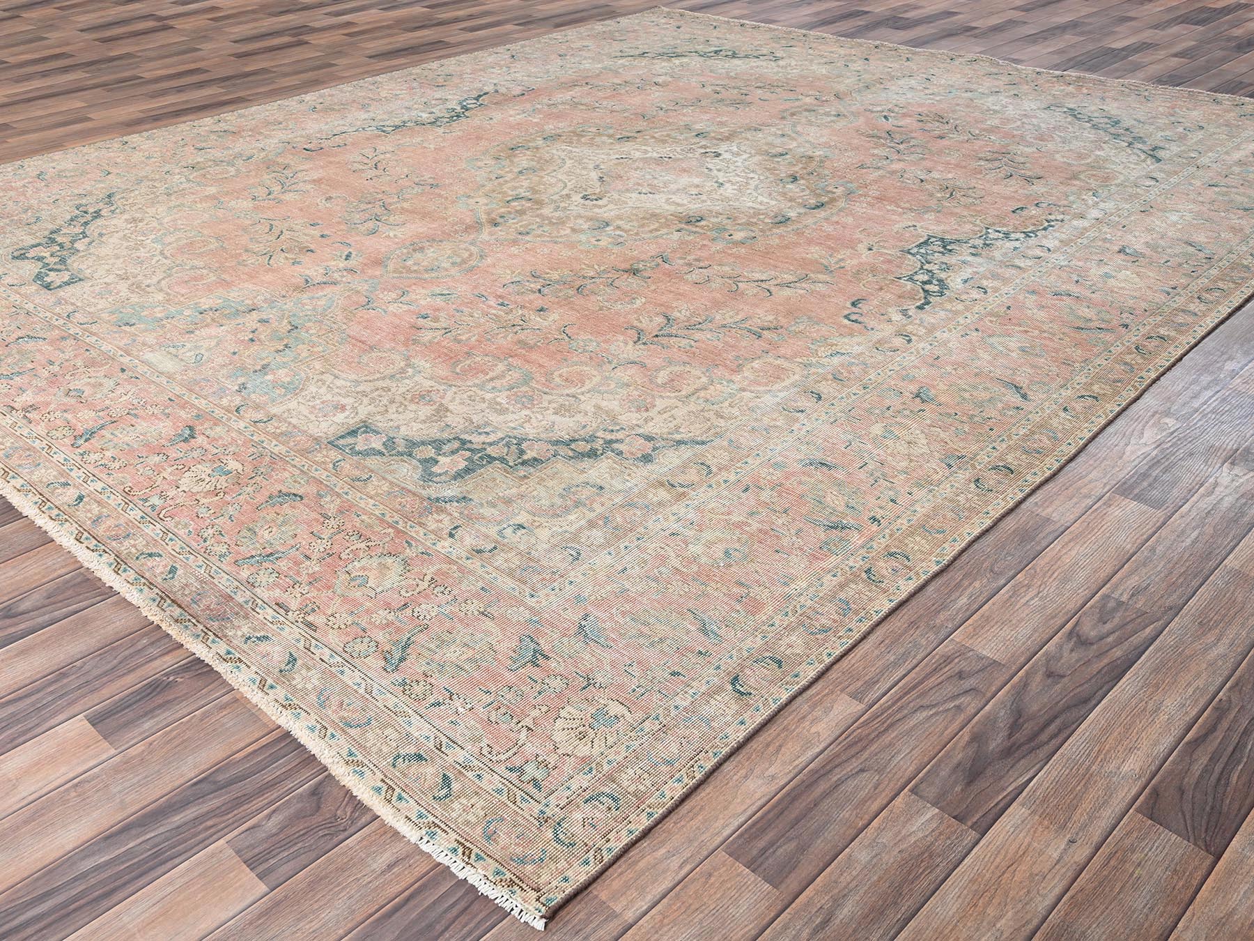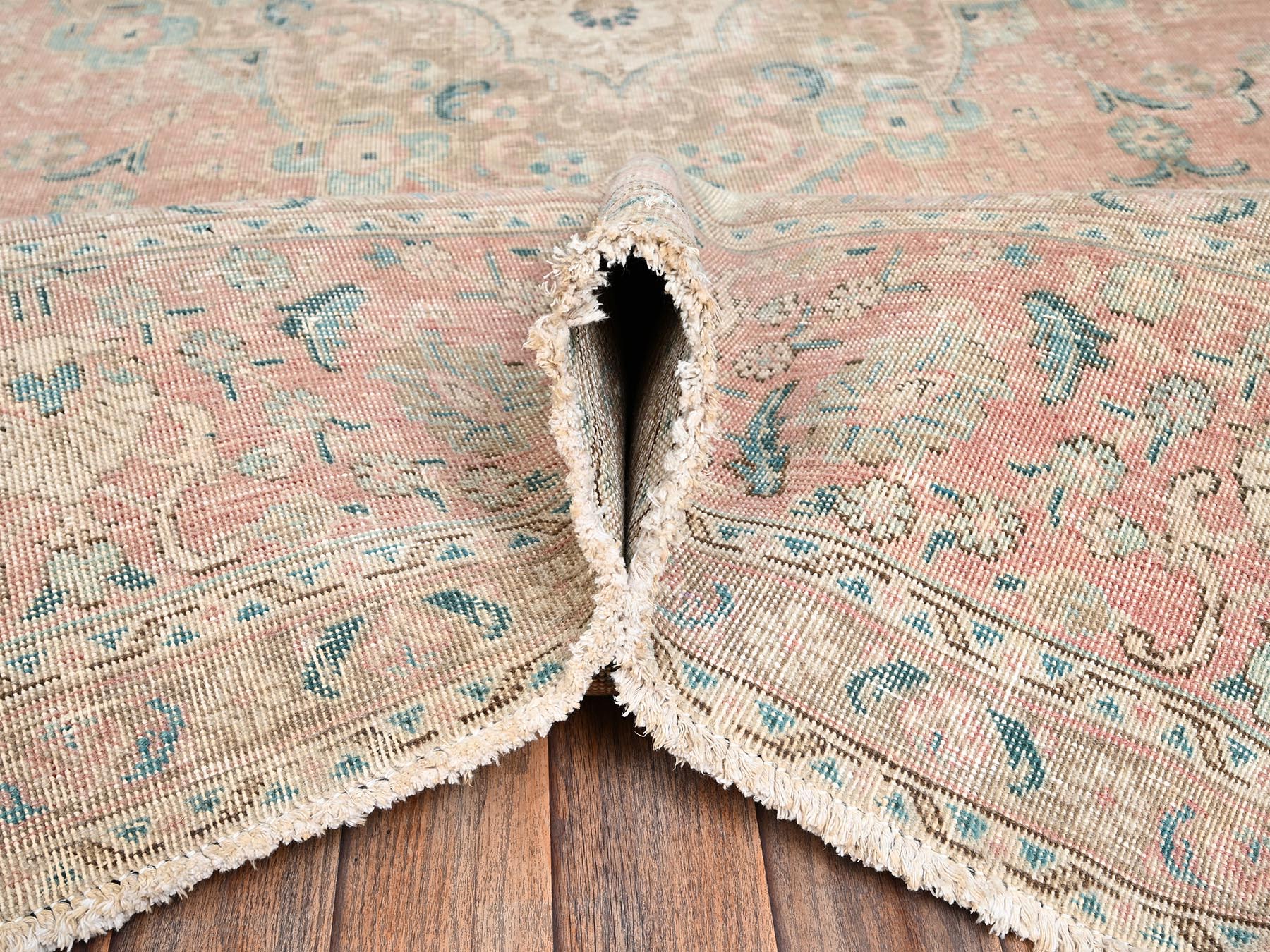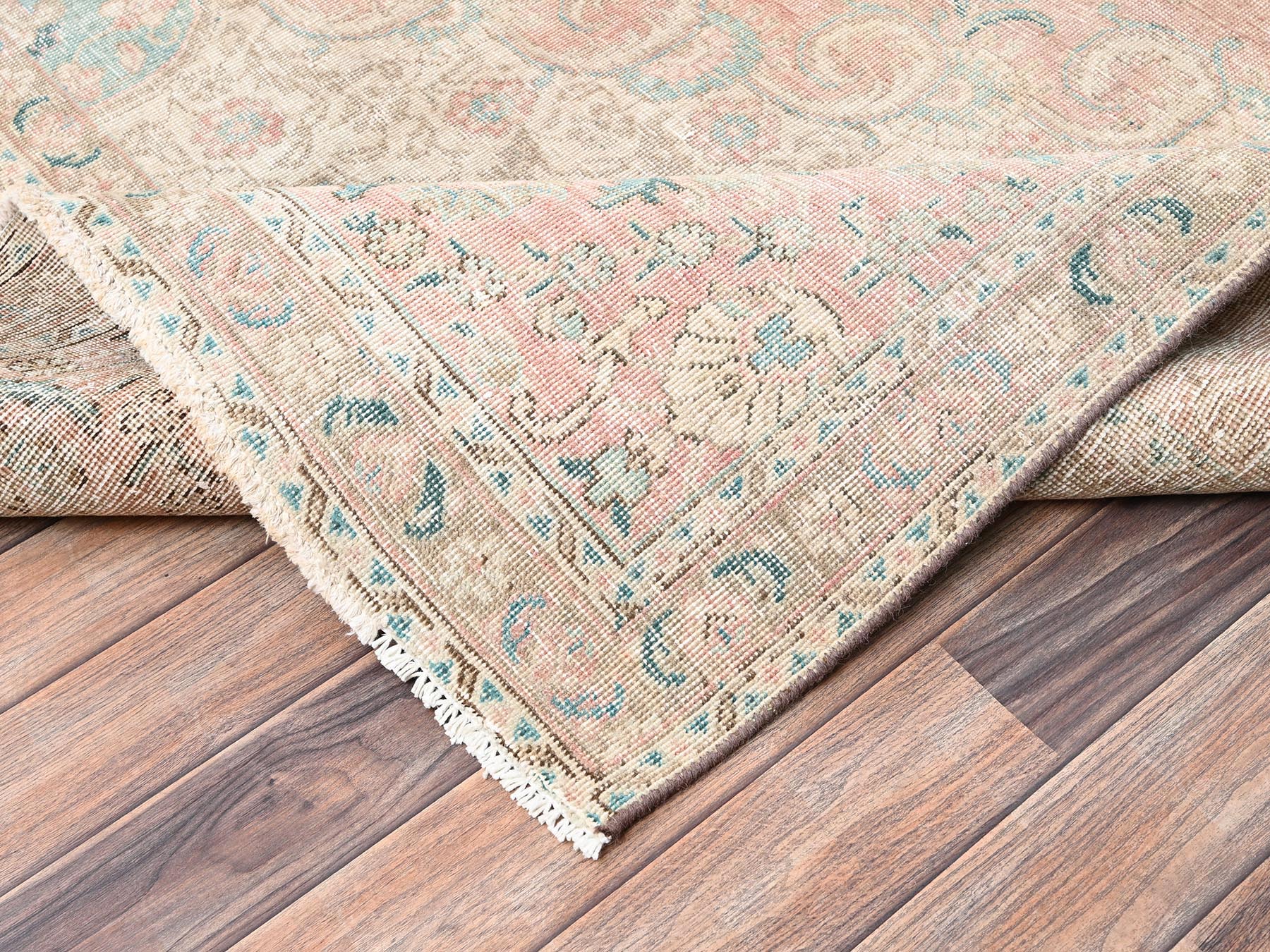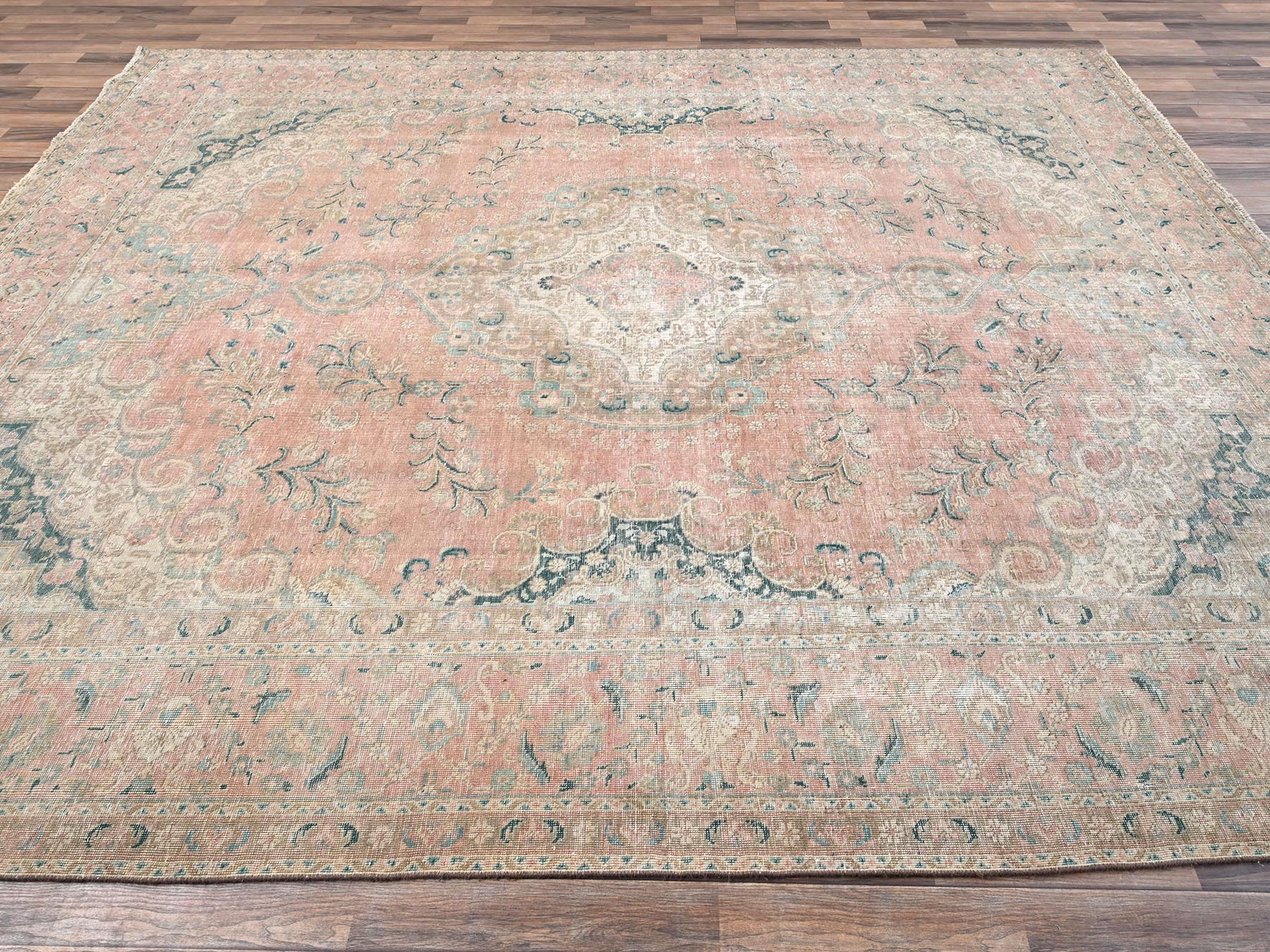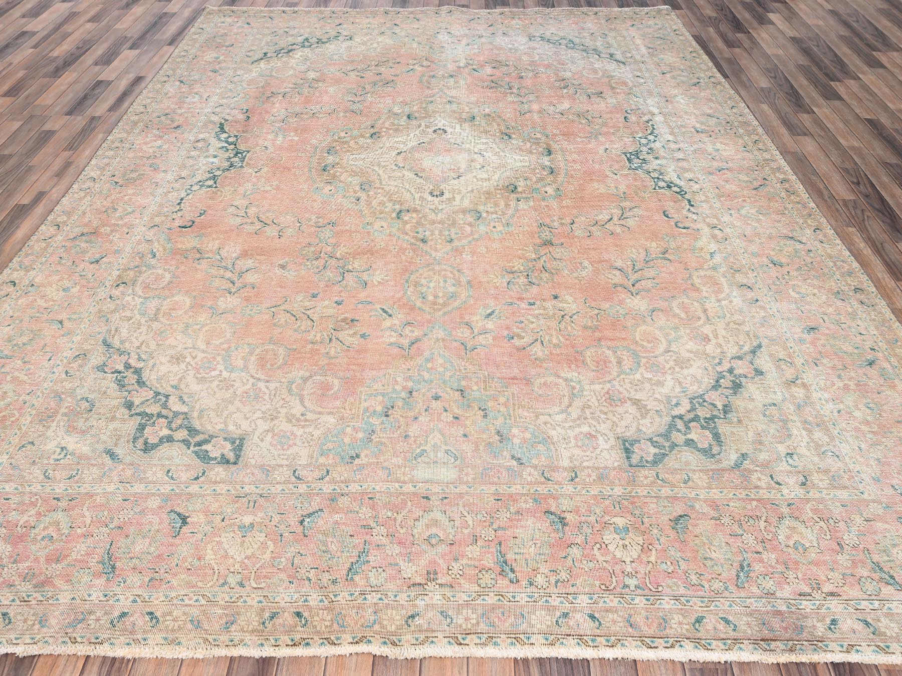 9’7″x12’2″ Rose Pink, Vintage Persian Tabriz, Clean and Soft, Worn Zero Pile, 100% Wool, Hand Knotted, Sides and Ends Secured, Oriental Rug HR2065