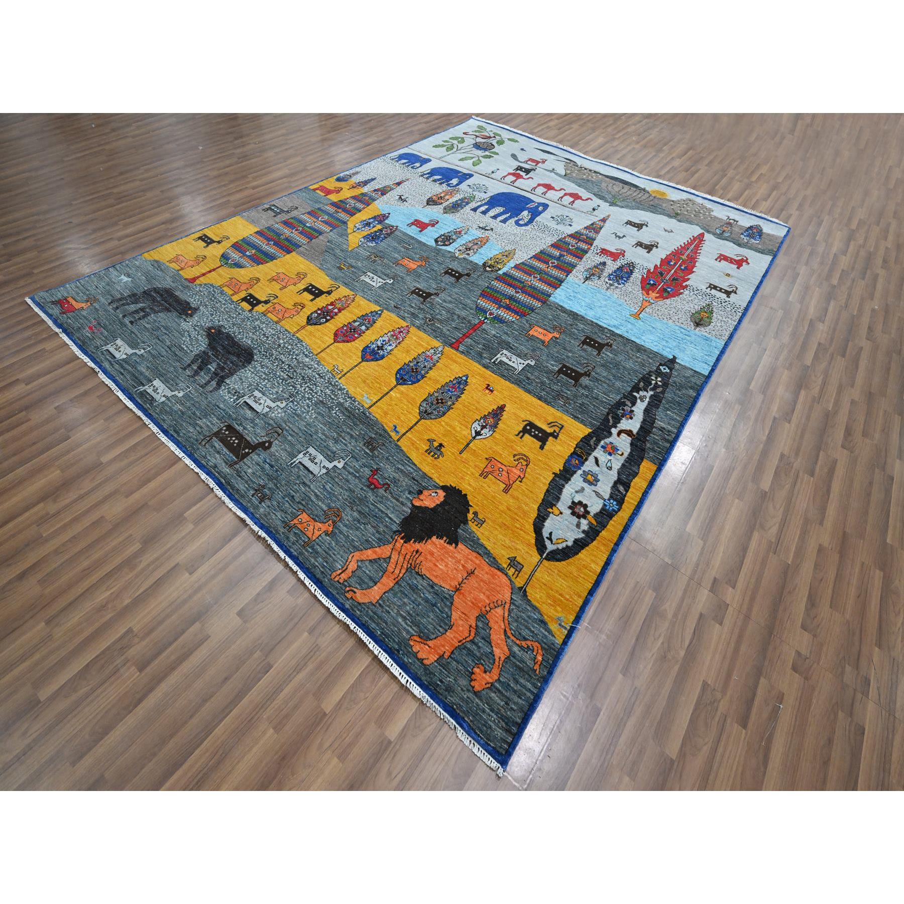 9’x12′ Shades of Gray, Colorful Pictorial, Agra, Ethnic Design with Cypress Tree, Lion, Elephants, Camels, Tigers and More, Hand Knotted, 100% Wool, Oriental Rug HR76314